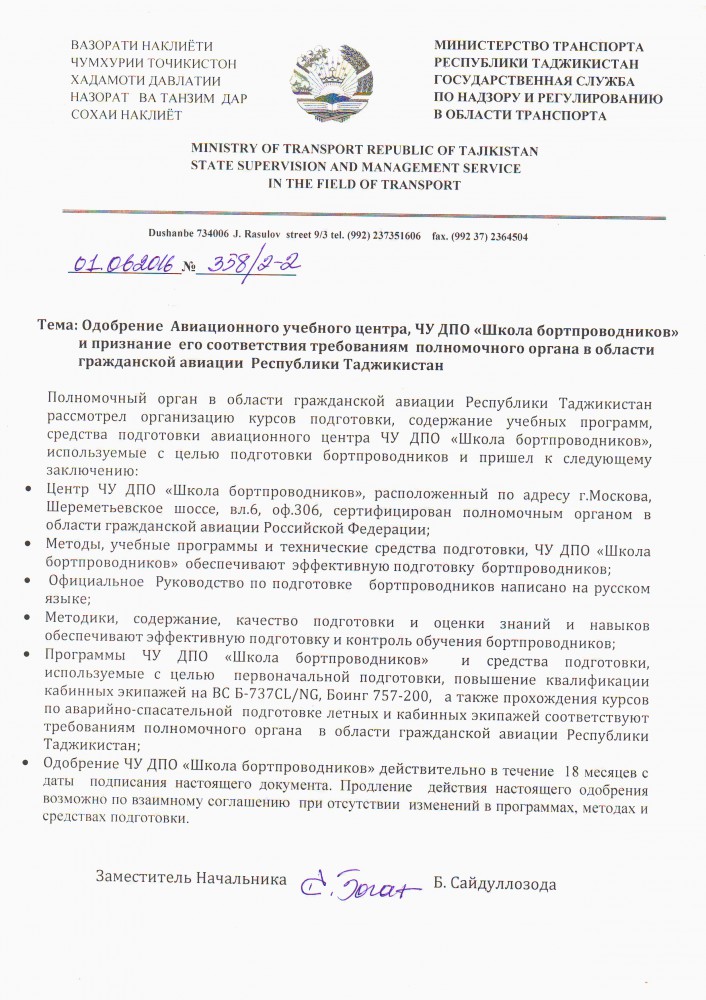 ЧУ ДПО "ШКОЛА БОРТПРОВОДНИКОВ" получила одобрение и признание соответствия требованиям полномочного органа в области гражданской авиации Республики Таджикистан.